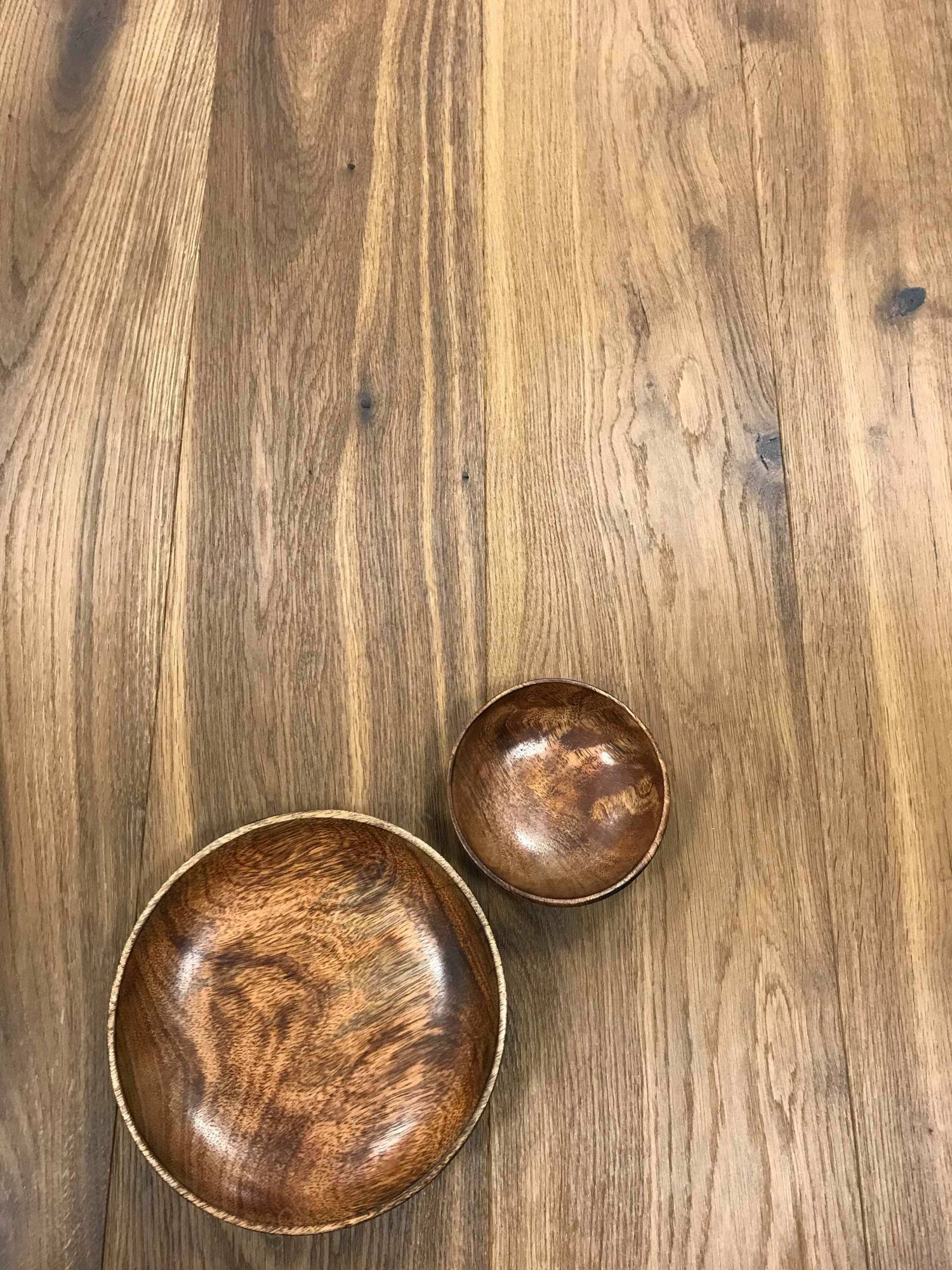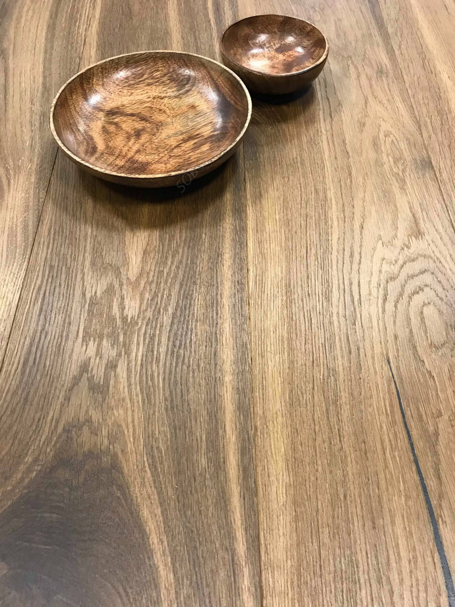 La technique du double fumage utilisée pour ce parquet équivaut à un chêne teinté dans la masse.